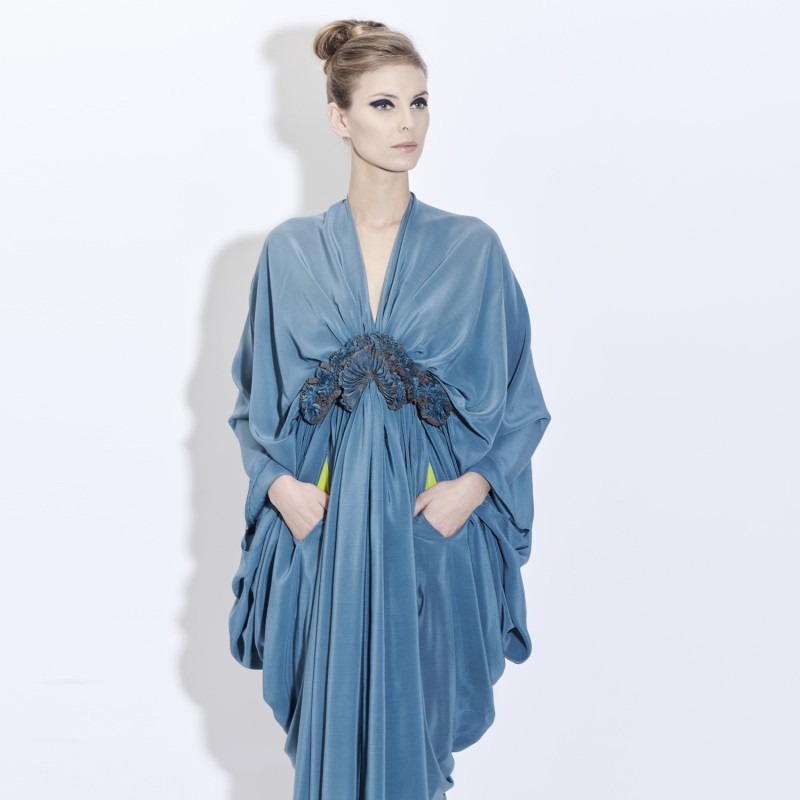 Selection of pleated and draped dresses in 100% silk china crepe.