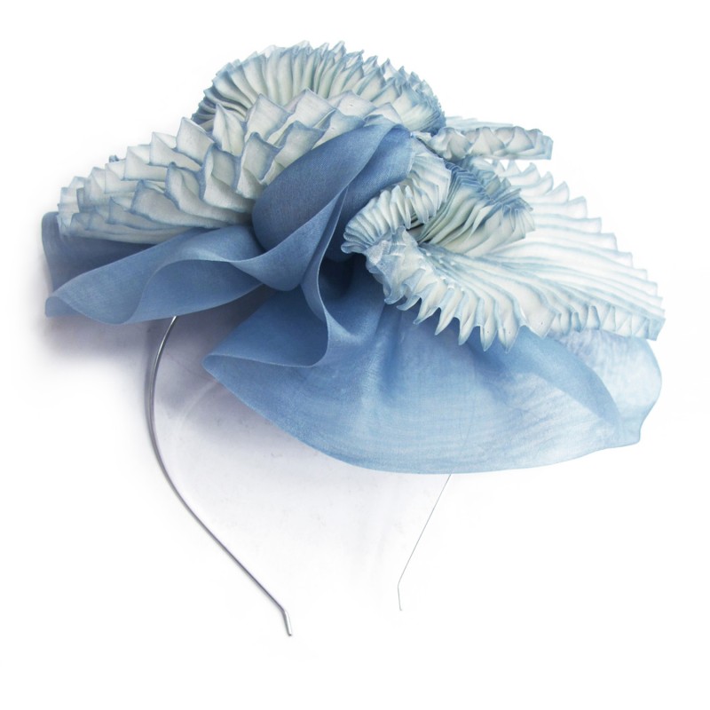 BIBI 015 : Pleated trim, in silk organza, forming a small beret composed of a pleated flounce and a non-pleated flounce, all mounted on a metal headband. Two-tone: raw white in the folds and blue grey on the surface.