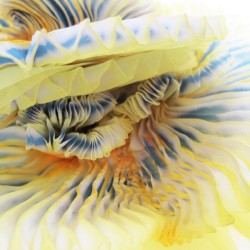 BIBI 016 : Pleated trim, in silk organza, forming a small beret composed of a pleated flounce and a non-pleated flounce, all mounted on a metal headband. Multicolor : clear blue in the folds and sun yellow and saffron yellow on the surface.