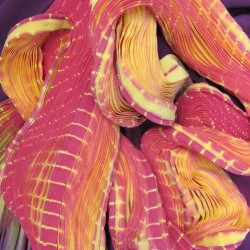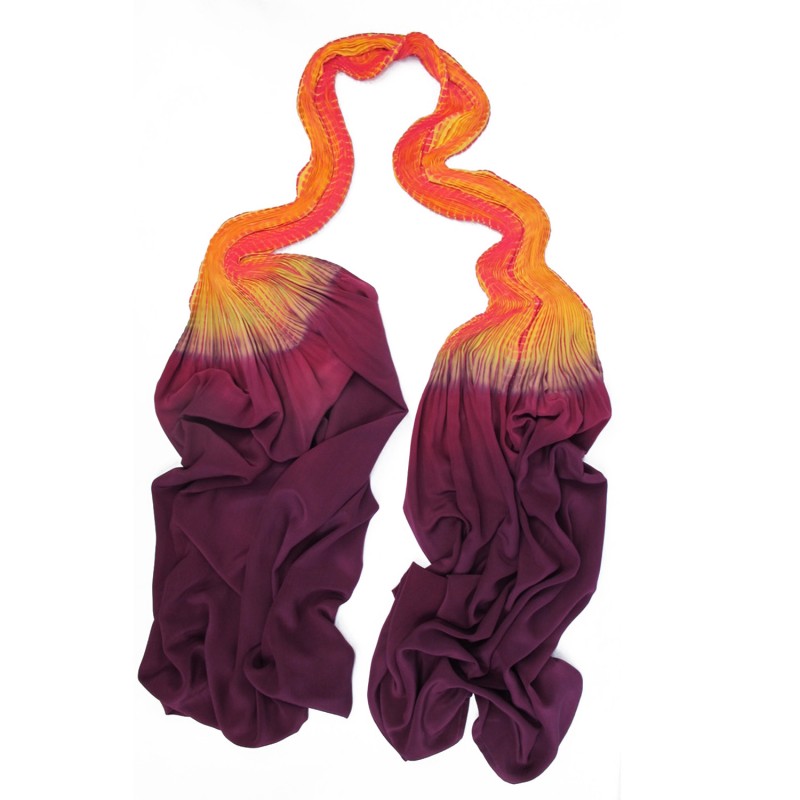 Plicacrepe 006 : Long pleated scarf in 100% silk crepe de chine, multicolored. Pleats in the center. Yellow in the folds and gradient from fuchsia pink to cardinal purple on the surface. This stole is weighted with a weighted thread