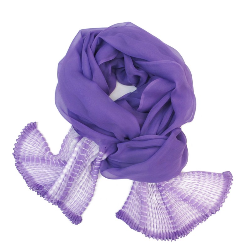 Coplicot 088. Long and Light silk chiffon scarf, pleated on two sides, at the ends. Two-tone: ecru in pleats and lilac on the surface. Needle pleating and dyeing inspired by a shibori technique.