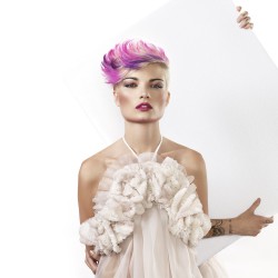 Les modèles portent des parures en organza de soie plissé et crêpe de soie plissé. Plissage à l'aiguille, teinture par réserve inspirée d'une technique de shibori.